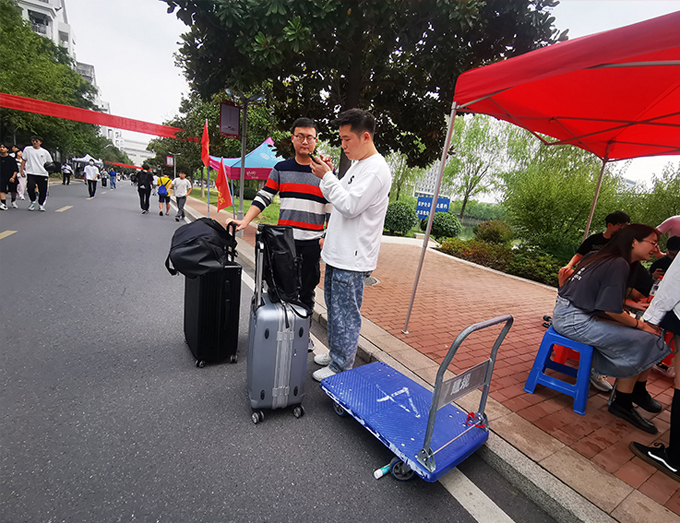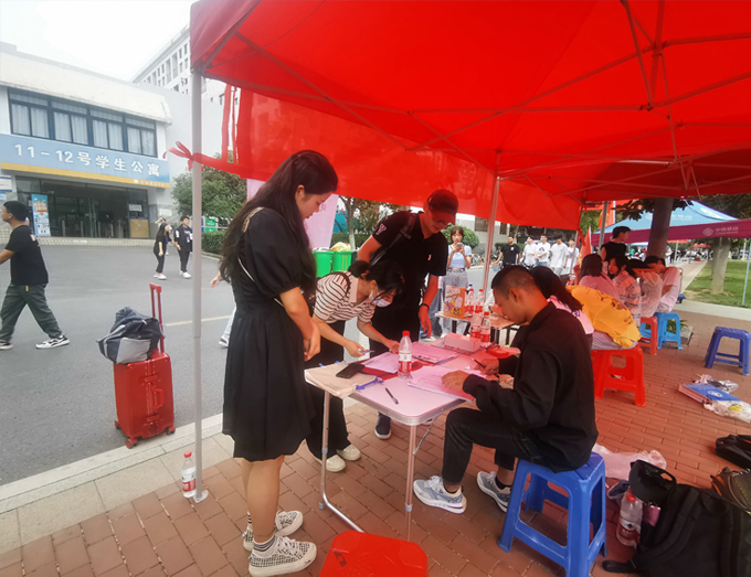 为了让新同学感受到学校这个暂且陌生地方的温暖,志愿者们早早搭好棚子忙碌起来,分别在校门口、行李暂存点、报名点等三个站点,迎接2022级新生的到来。因为受疫情的影响,新生家长都不能进校,行李搬运的工作就落到了志愿者的身上。学长学姐热心服务,给学弟学妹们发放“建大蓝”校园卡、新生手册,核实新生报名信息,分配寝室,从核验健康码处到校门口,从报名点到宿舍楼,哪里有需要志愿者们就出现在哪里。