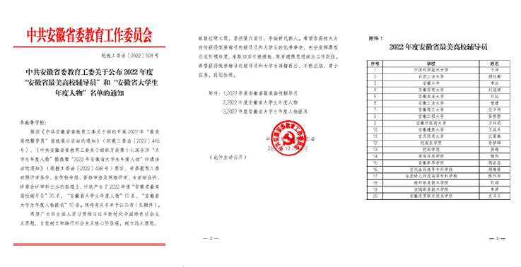 本网讯 10月13日,安徽省委教育工委公布了2022年“最美高校辅导员”推选结果,建筑与规划学院专职辅导员王昊禾获2022年“最美高校辅导员”,并推选参加2022年全国“最美高校辅导员”评选,也是安徽建筑大学目前唯一一位获得此项荣誉的辅导员。