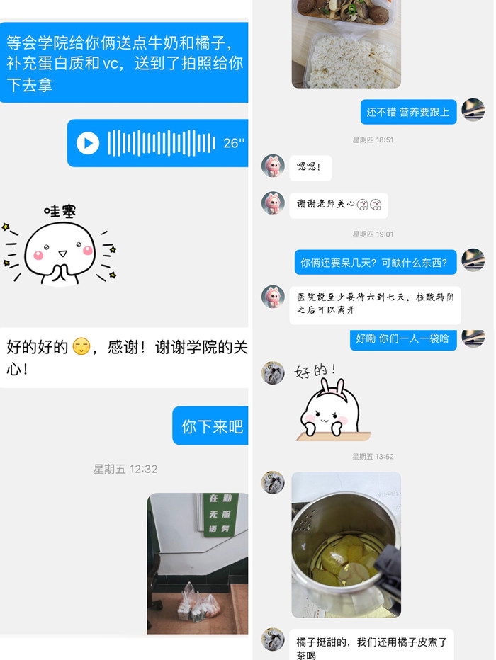 自部分学生封控隔离以来,建规学院与隔离点考研学子时刻保持线上联系,关心学习生活、身心健康,做到“问题有解决,需求有满足”,保证“一对一”精准定向服务。同时,为隔离点考研学子送去水果、牛奶等“加油包”。