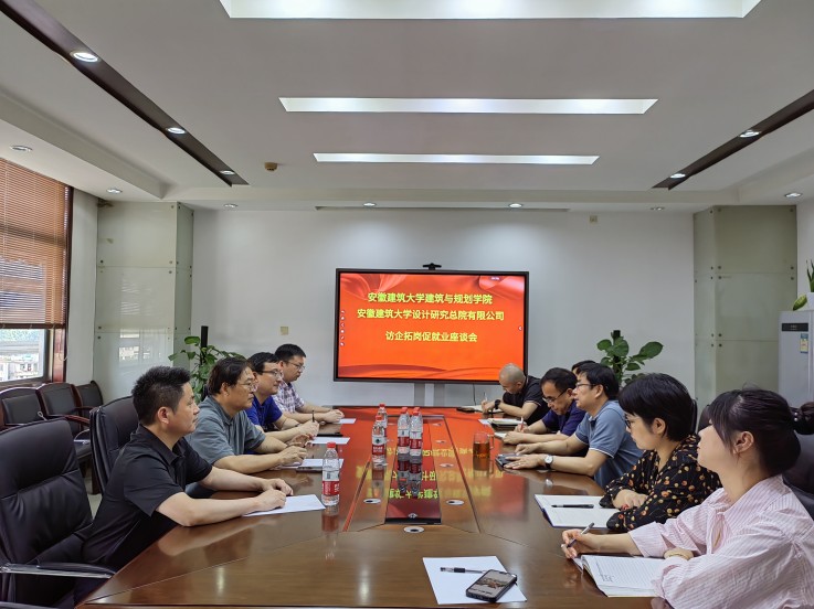 本网讯 6月14日,建规学院班子成员赴安徽建筑大学设计研究总院有限公司访企拓岗,推介毕业生。公司总经理李永杨、副总经理曹宏伟接待了建规学院班子一行。