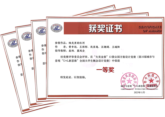 本届竞赛实行“政府出题,高校答题”模式,以“大美金寨”口袋公园为主题,要求在设计中充分彰显金寨县的红色基因和绿色本底。经竞赛组委会初评和评委会复评,我校多个作品脱颖而出,建规学院研究生王倩等创作的《赓红续绿,行迹如圆》以及本科生黄幸远等创作的《烛光里的红河》获得一等奖,研究生迟梦萍等创作的《韶华·贤画》以及研究生李照天等创作的《时代更迭,“适”往新生》获得三等奖,是我校学子首次在该项赛事中获奖。