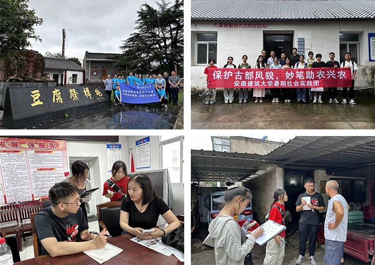 “保护古都风貌,妙笔助农兴农”安徽建筑大学暑期社会实践团由2名领队、3名指导老师、6名研究生、7名本科生组成,团队分为产业发展调研、村干村民访谈、实地踏勘调研绘图等小组。通过三天的调研发现大泉村具有良好的区位优势、交通优势、产业优势、文化优势,拥有国家级非遗项目八公山豆腐、省级非遗紫金砚制作技艺传承人,围绕乡村文旅发展,调研团队在标志性景点建设、网红打卡点营造、豆腐发源地IP记忆点挖掘上深入探讨,完成部分设计手稿,为地方进一步规划提供参考。