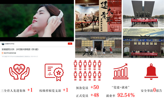 强化组织建设,提升堡垒效能。学院党支部持续打造“一支部一特色”。由支部精心制作的校宣传片《听·建》获全国“美丽乡村建设故事”唯一特等奖,社会反响良好;3位支部书记录制的“党纪学习青年说”专题也在学习强国“听文化”频道面向广大听众,有效提升了组织凝聚力和宣传影响力。教育实践方面,驱动师生深入行业一线,走访校友企业,调研优秀作品,显著增强学生专业自信;同时,通过推进“党建+实习就业”联动模式,助力我院就业率高达92.54%。此外,引领强化师德师风,提升育人质量,2024年学院建设出1支“四有”好老师团队、荣获“三全育人”先进集体,这些荣誉充分展现了教育人的崇高使命和时代担当。