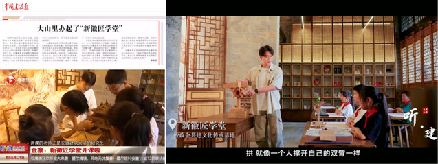 “新徽匠学堂”根植于我校四十年来对我省传统建筑的研究与传承,2023年1月正式在金寨县丁埠村挂牌,项目持续通过传统工匠、建筑学子、中小学生以及境外师生之间的文化传承与技艺传递,将徽派建筑文化守护住,将“徽匠精神”传下去,形成了“四位一体”的地域建筑文化传播助力乡村振兴新模式。