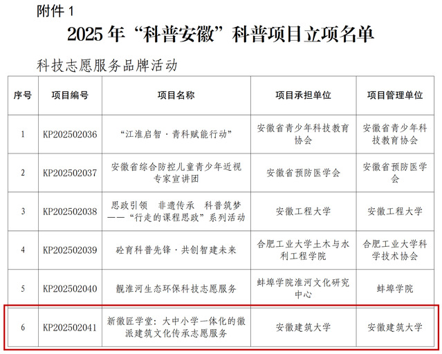 本网讯 近日,安徽省科学技术协会公布了2025年“科普安徽”科普项目立项名单,由我校建规学院牵头申报的“新徽匠学堂:大中小学一体化的徽派建筑文化传承志愿服务”项目成功入选科技志愿服务品牌活动。这也是继2024年我校获批“安徽省中华优秀传统文化传承基地”和“安徽省社科普及优秀典型案例”后,在徽派建筑文化传承领域获得的又一殊荣。