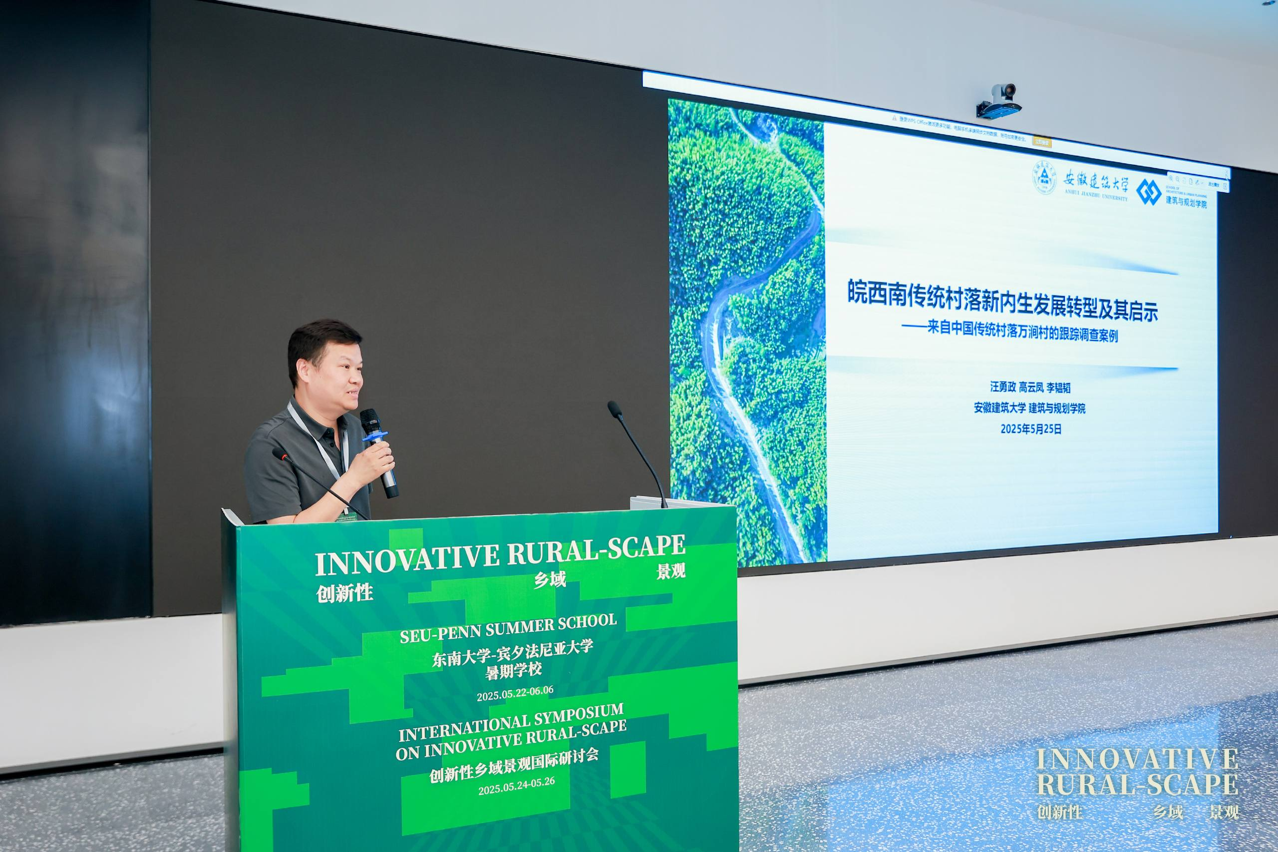 本次国际研讨会围绕乡土中国的文脉与创新,探析乡村振兴战略实施进程中乡域景观的创新性演进主题。聚焦“城乡融合的观念认知与路径探索”“乡域地景中的设计智慧与新生潜能”“面向乡域未来的创新思维与创意架构”三大议题。李早主持学术报告,东南大学建筑学院院长张彤、宾夕法尼亚大学韦茨曼设计学院博士项目部主席Franca Trubiano,以及来自宾夕法尼亚大学、东南大学、同济大学、上海交通大学、中国美术学院、安徽建筑大学、合肥工业大学等高校、设计院多位学者分享主题学术报告。建规学院规划系主任汪勇政教授受邀做主题报告。汪勇政以“皖西南传统村落新内生发展转型及其启示”为主题,展现了学校“遗产保护与数智治理”科研团队扎根皖西大别山传统村落,开展持续跟踪调查,把论文写在大地上的阶段性科研成果。