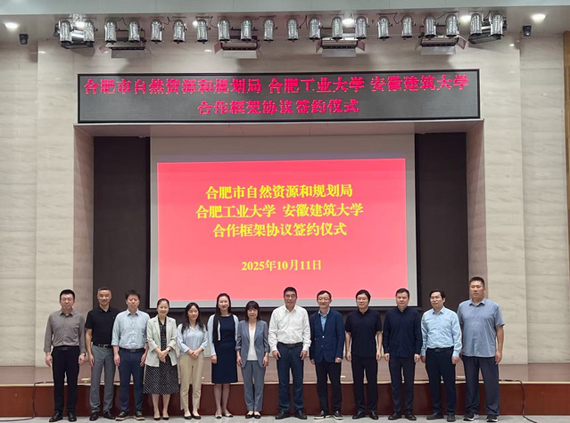 本网讯 10月11日,由合肥市自然资源和规划局主办的“国土空间规划实践教学共同体”签约仪式隆重举行。安徽建筑大学、合肥工业大学、合肥市规划设计研究院、合肥市测绘院等单位共同签署院企合作框架协议,开启政产学研协同育人新篇章。合肥市自然资源和规划局党组书记、局长储昭海,安徽建筑大学建筑与规划学院党委书记吴运法等相关领导出席活动并致辞。