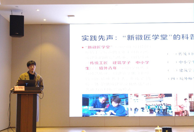 “新徽匠学堂”科普志愿者、安徽省徽派建筑重点实验室硕士研究生彭智敏以《“科”与“普”的对望:安徽建筑大学星火馆建设初探》为题作主题分享,他从项目定位、实践创新、成效转化三个维度展开详细阐述。“新徽匠学堂”依托学校四十余年徽派建筑研究积淀,整合徽派建筑博物馆、安徽省徽派建筑重点实验室等优质资源,于2023年正式挂牌成立,2024年获批安徽省中华优秀传统文化传承基地,确立了“守护建筑文化、传承徽匠精神”的核心使命,构建起覆盖大中小学生、境外师生及社会公众的全人群服务网络。