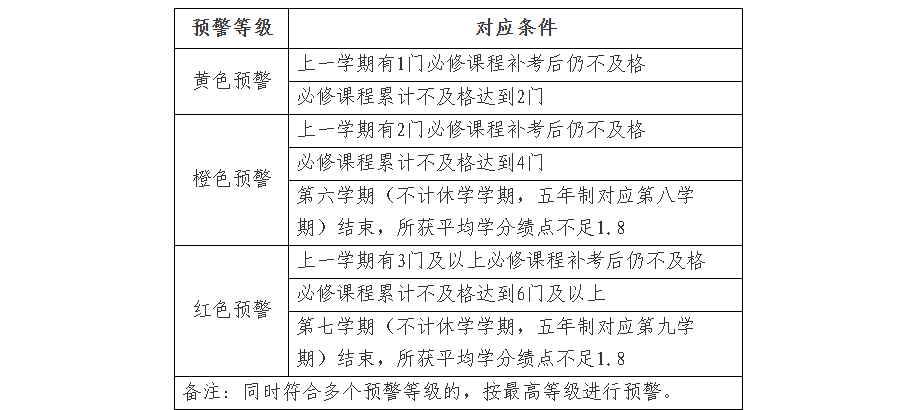 第三条 学业预警按照程度由低到高依次分为黄色预警、橙色预警和红色预警三个等级,划分依据是学生上一学期修读课程情况。具体预警等级和条件按下表执行。