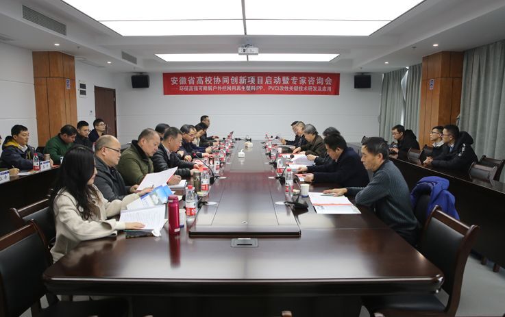 本网讯 1月18日下午,我校作为牵头单位承担的安徽省高校协同创新项目“环保高强可降解户外栏网用再生塑料(PP、PVC)改性关键技术研发及应用”启动暨专家咨询会在实验综合楼第三会议室召开。安徽省教育厅科研处一级调研员许绪荣、副校长蔡新立出席会议并致辞,来自中国科学技术大学、合肥工业大学和安徽大学的专家、科技处及材化学院负责人、课题组骨干成员参加了会议。