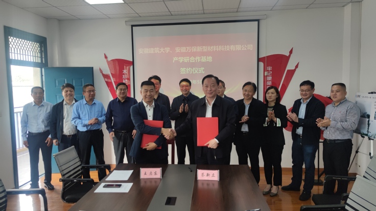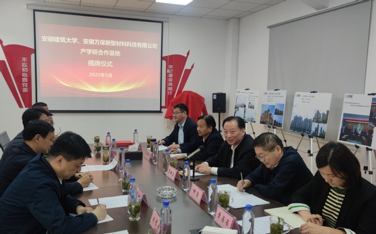 本网讯 5月13日,校党委常委、副校长蔡新立率队赴安徽万保新型材料科技有限公司开展产学研合作调研。学校科技处、科技成果转化处、环能学院、经管学院、材化学院相关部门参加调研。省住房建设厅建筑节能与科技处处长陈必喜、安徽万保新型材料科技有限公司总经理王启东等热情接待了蔡新立一行。