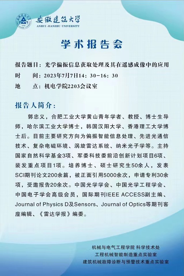2023年第26场学术报告:光学偏振信息获取处理及其在遥感成像中的应用