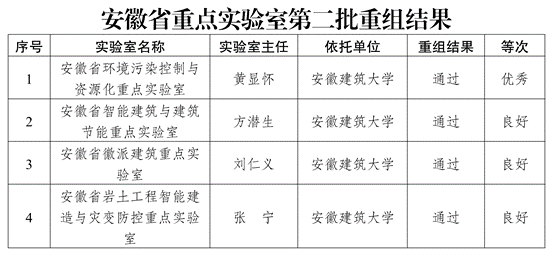 本网讯 近日,安徽省科技厅公布了第二批安徽省重点实验室重组评审结果,我校“安徽省环境污染控制与资源化重点实验室”、“安徽省智能建筑与建筑节能重点实验室”、“安徽省徽派建筑重点实验室”和“安徽省岩土工程智能建造与灾变防控重点实验室”等四个安徽省重点实验室全部通过重组,其中安徽省环境污染控制与资源化重点实验室获评“优秀”等级,另三个实验室获评“良好”等级。