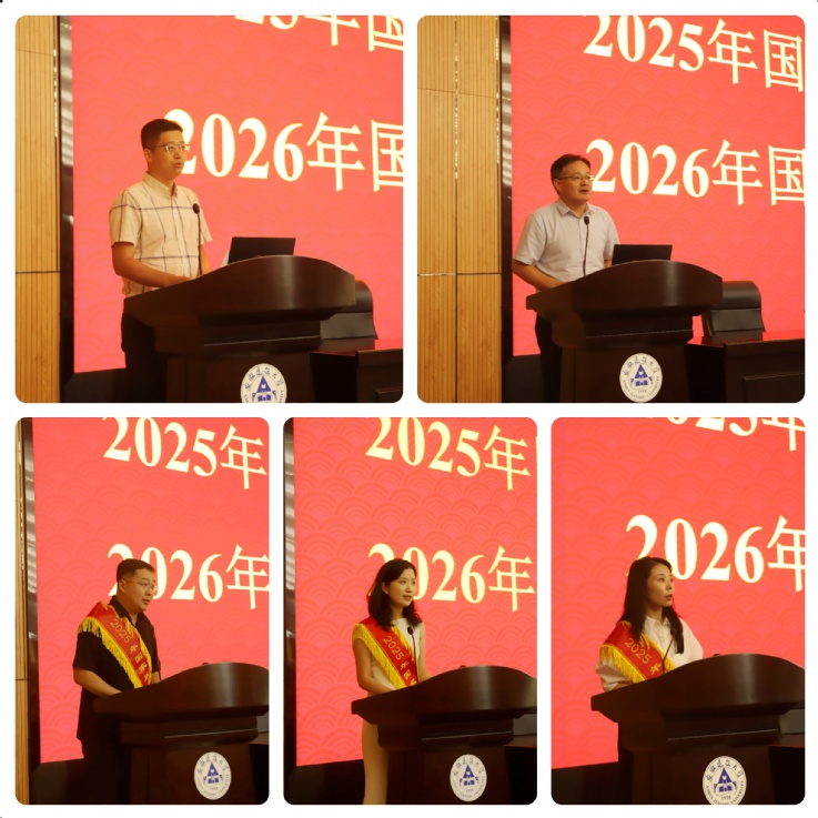 土木工程学院院长张宁、材料与化学工程学院院长王爱国分别代表学院上台作国家基金经验交流发言。环境与能源工程学院教师胡浩威,建筑与规划学院教师陈雨露,经济与管理学院教师戴克清作为教师代表上台分享国家基金申报经验与心得体会。