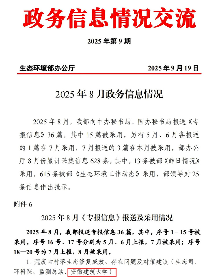 本网讯 近日,生态环境部办公厅政务信息通报,生态司、环科院、监测总站、安徽建筑大学提交,我校顾康康教授、董冬副教授撰写的《荒废古村落生态修复成效、存在问题及对策建议》被中办秘书局、国办秘书局采用。报告紧扣国家乡村振兴政策需求,通过长期实地调研、多维度的大数据分析和跨领域的专家研讨,系统梳理我国荒废古村落生态修复发展现状和成效,精准识别存在的关键问题,更提出了一系列具有创新性和可操作性的对策建议,这些建议对于荒废古村落活化具有重要的参考意义。