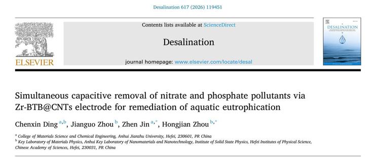 本网讯 近日,材料与化学工程学院金震副研究员与中科院合肥物质科学研究院固体物理研究所周宏建研究员联合指导的硕士研究生丁晨鑫在环境水处理领域国际期刊《Desalination》(中科院一区,IF=9.8)发表题为“Simultaneous capacitive removal of nitrate and phosphate pollutants via Zr-BTB@CNTs electrode for remediation of aquatic eutrophication”的研究论文,安徽建筑大学为论文第一完成单位。