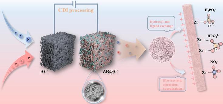 本研究开发了一种基于锆基金属有机框架的复合电极材料 Zr-BTB@CNTs,并结合电容去离子(CDI)技术实现了硝酸盐与磷酸盐的高效共去除。通过将 Zr(IV) 金属中心与 1,3,5-三(4-羧基苯基)苯(H3BTB)配体锚定于碳纳米管(CNTs),成功构建了具有丰富缺陷结构的三维导电纳米网络。实验结果表明,Zr-BTB@CNTs电极在 1.2 V 工作电压下对 500 mg L-1 的 NO3- 和 PO43- 表现出显著的协同吸附性能,其吸附容量分别达到 222.1 mg g-1 和 159.9 mg g-1。该电极在宽 pH 范围(3-11)内表现出稳定的电化学活性,并在连续 10 次吸附-再生循环后仍保持高于 80% 的污染物去除率。此外,该电极具有实际应用潜力,在处理实际富营养化水体(巢湖、南淝河)和工业含氮磷废水后均符合世界卫生组织(WHO)排放标准。该研究为CDI技术实现了硝酸盐与磷酸盐的高效共去除提供了新思路。