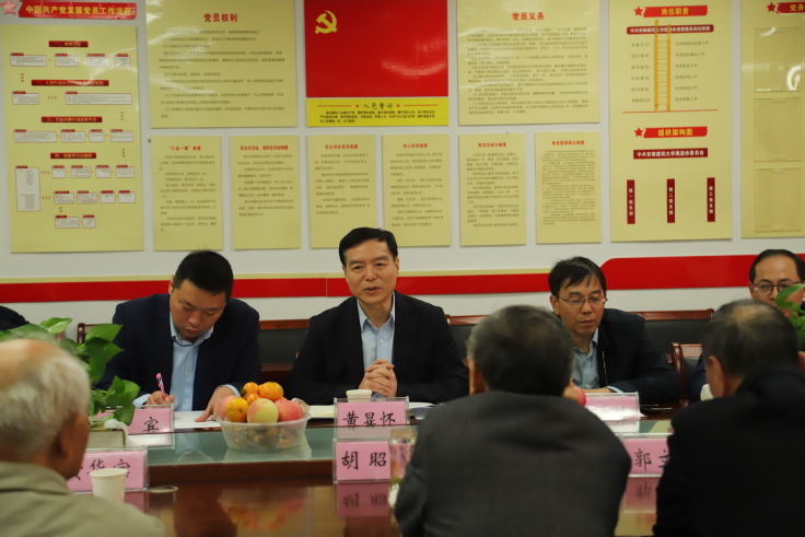 座谈会上,黄显怀首先代表学校党委、行政向全体离退休教职工致以诚挚的问候和节日的祝福,并为参加座谈会的老同志代表一一赠送重阳节礼物。