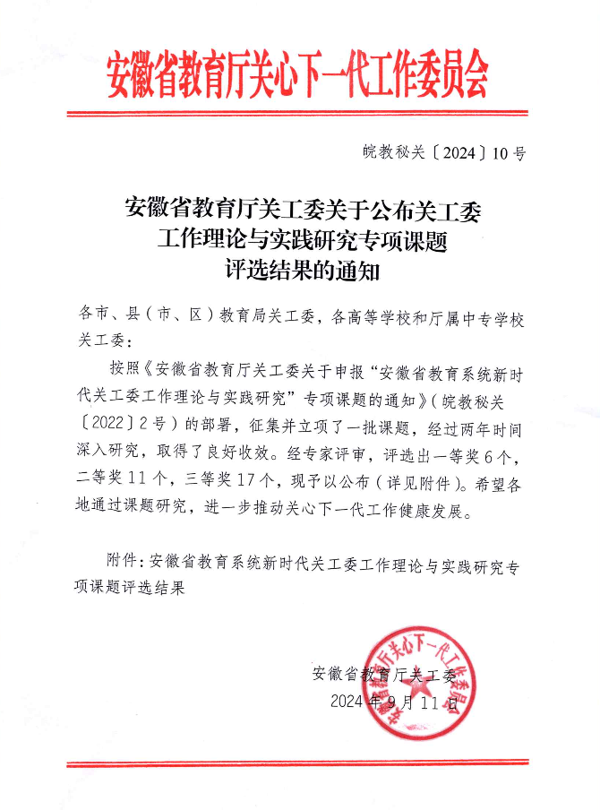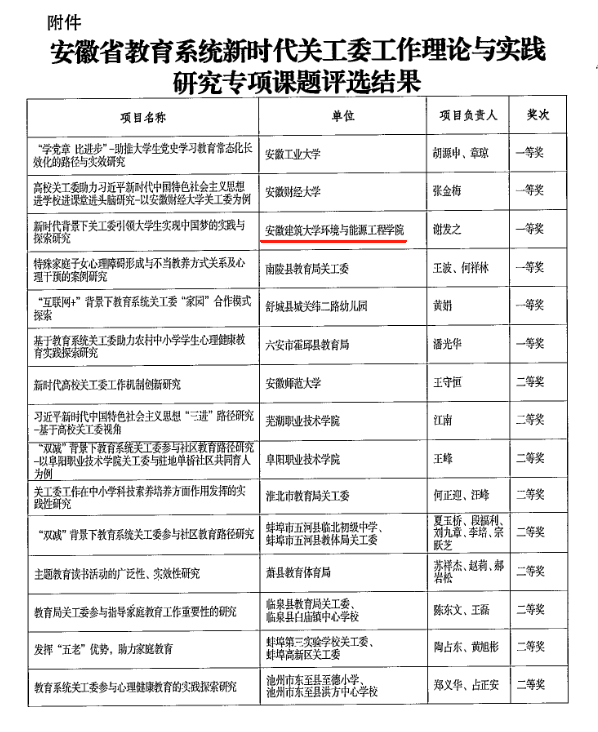 本网讯 近日,安徽省教育厅关工委公布了关工委工作理论与实践研究专项课题评选结果,我校谢发之教授主持的《新时代背景下关工委引领大学生实现中国梦的实践与探索研究》项目荣获一等奖。
