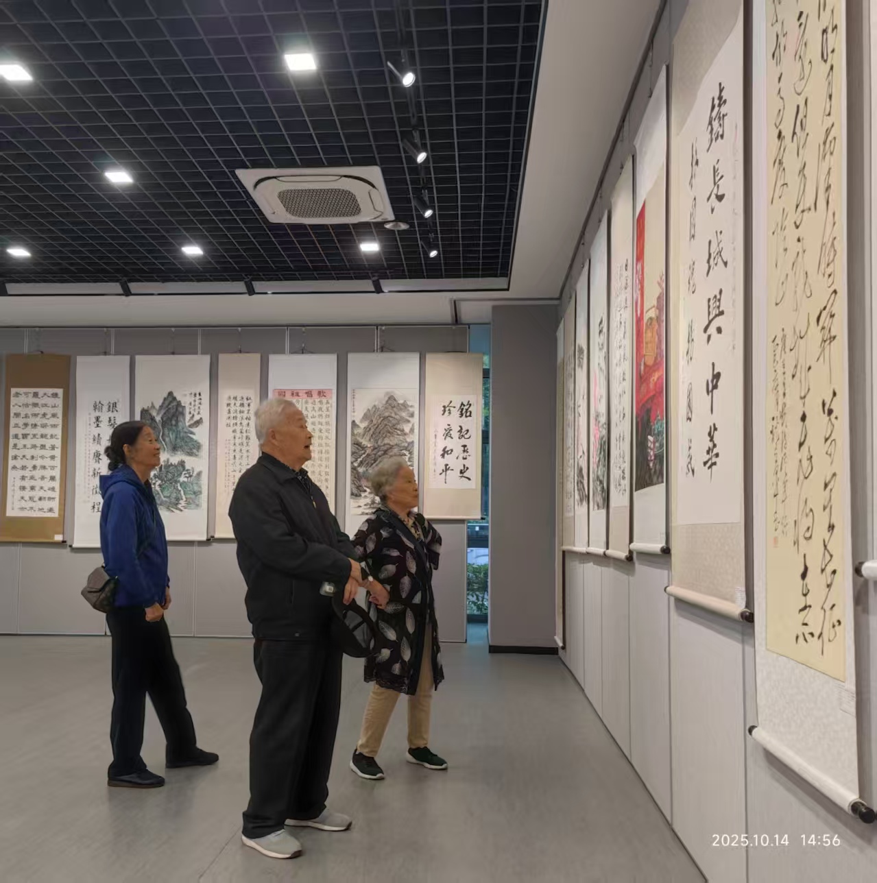 本网讯 10月14日下午,我校老年书画摄影研究会组织会员前往合肥老年大学,参观市老干部局开展的“银发丹心忆抗战 翰墨赓续新征程”全市老干部系统书画摄影展。