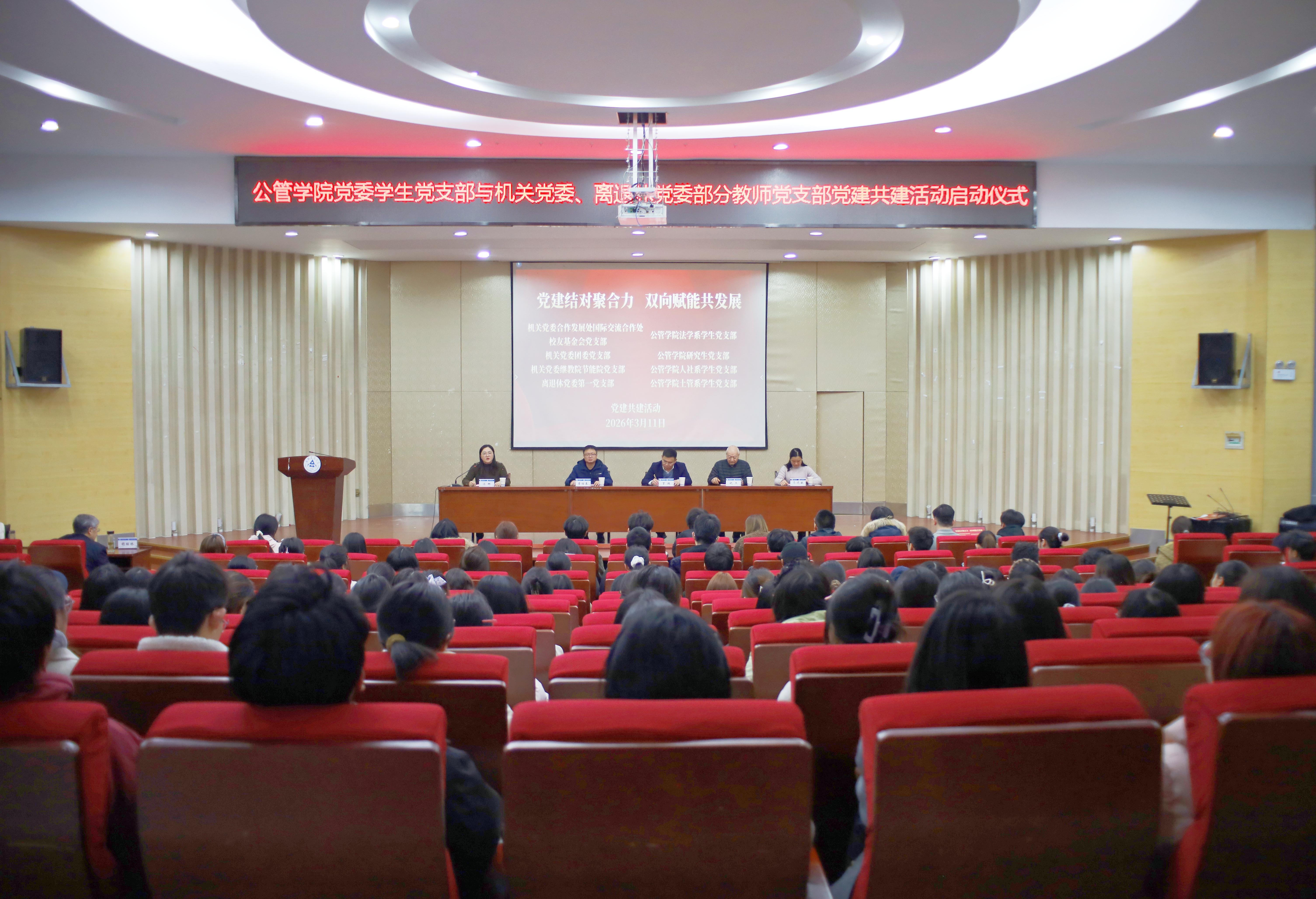 本网讯 党建结对聚合力,同心育人启新程。党建共建是强化基层党组织政治功能和组织功能的重要抓手,更是以高质量党建引领学校高质量发展、落实立德树人根本任务的有效路径。为深入贯彻新时代党的建设总要求,全面落实学校《关于进一步深化改革,加强效能建设的实施意见》及“高效办成一件事”工作部署,推动基层党组织资源整合、优势互补、互助共进,构建师生联动、多方协同的育人新格局,3月11日下午,离退休第一党支部与公管学院党委学生党支部、机关党委在金寨路校区图书馆二楼报告厅举行党建共建活动启动仪式,离退休第一党支部代表、机关党委、学院学生党支部书记和200余名学生党员及骨干参加仪式,公管学院党委书记汤娜主持会议。