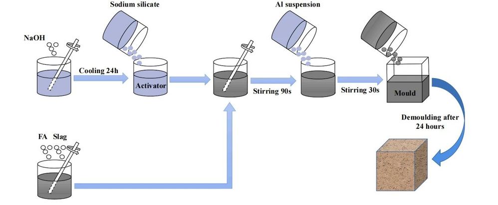 孔隙特征由浇注/发泡阶段孔隙与地聚物浆料的相互作用决定。在浇注/发泡阶段,孔隙与地聚物物浆受力情况。物理发泡产生的气泡受到浮力、粘滞阻力和重力(即排水力)。而重力和浮力的差异导致气泡的垂直运动和气泡大小的不均匀分布。气泡大小沿高度分布不均匀。在极端情况下,由于小气泡的凝聚,气泡的体积和浮力会大幅增加,然后较大的气泡会漂浮到表面并破裂,从地聚物泡沫混凝土中大量逸出的气体可能会导致塌膜。因此,在物理发泡混凝土中,孔隙的凝聚对体系稳定起到负面作用。相比之下,人们对化学发泡混凝土发泡过程中孔隙与浆体之间的相互作用关注不多。综合来看,现有研究大多涉及地聚物泡沫混凝土的制备技术和成分设计,目的是优化其宏观性能。虽然已知孔隙的大小和形状对混凝土性能有很大影响,但是在制备过程中,气体和粘合剂如何相互作用,进而影响这些孔隙的细节,这方面的研究还不够。这种相互作用对确定混凝土的最终质量和性能至关重要。