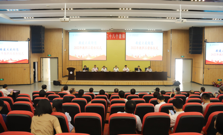 本网讯 9月9日,学校在南校区实验综合楼二楼报告厅隆重召开安徽建筑大学教职工荣休仪式。校领导孙道胜、黄显怀、蔡新立、王玉兰、闵杰、蔡国军、李早出席大会,2022年荣休教师、新进教职工,师德标兵、优秀教师、优秀教育工作者等教师代表、全体处级干部参加会议。会议由党委副书记、校长黄显怀主持。