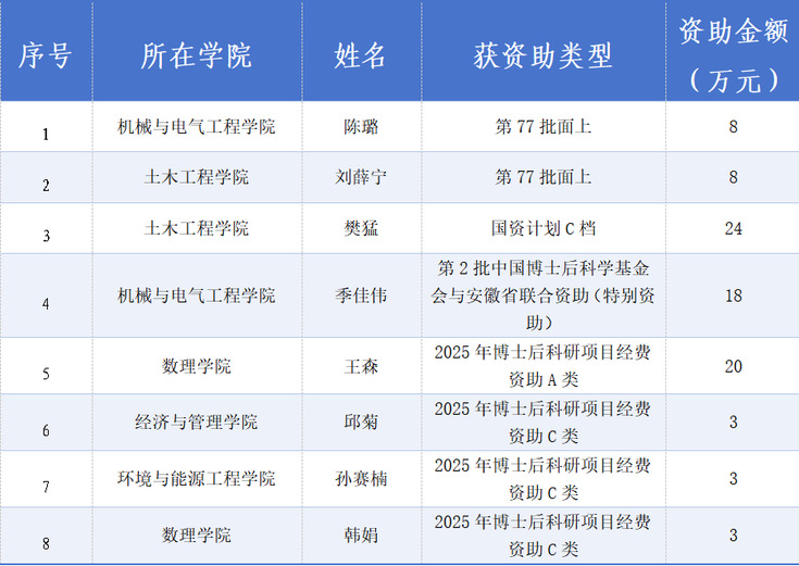 本网讯 近日,中国博士后科学基金会及相关部门陆续公布了2025年度各类博士后科研项目资助名单,我校博士后表现出色,实现了多方面的突破,共获批国资计划C档1项、第77批面上资助2项、第2批中国博士后科学基金会与安徽省联合资助(特别资助)1项,另有4人获得省博士后研究人员科研项目资助,经费总额87万元。此次获批的数量和总金额均创历史新高,并在中国博士后科学基金面上项目、国家资助博士后研究人员计划方面取得了显著突破,体现了我校博士后科研质量和水平整体跃升。