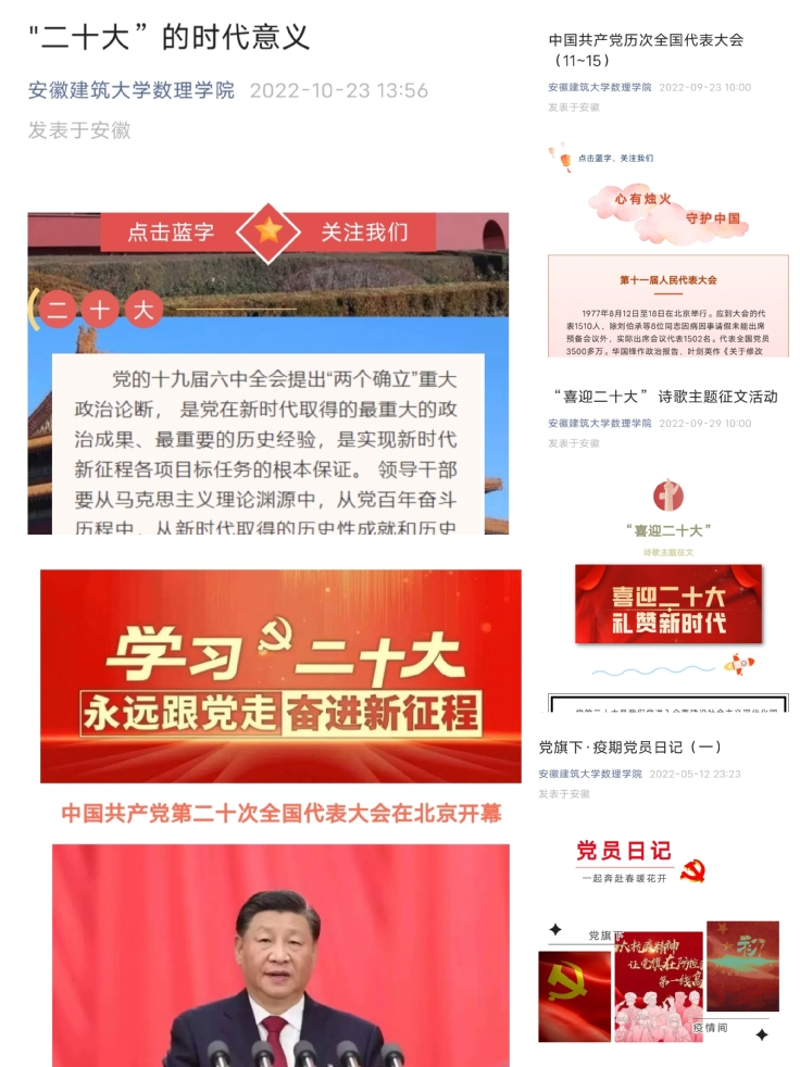 习近平总书记指出:一个民族要走在时代前列,就一刻不能没有理论思维,一刻不能没有正确思想指引。2022年,学院坚持用党的创新理论教育引导青年大学生,强化思想共识。采取线上线下相结合的方式,组织学生开展“悦读·习语”“Ω文化节”等特色活动,从最初的分享“自己最喜爱的习近平总书记一句话”拓展到以“讲党史、讲党章、讲故事、讲体会、讲践行”为核心理念的党旗下的“五讲”。为形成常态化学习机制,2022年初,学院成立“小欧”先锋宣讲团,选拔培训优秀党员,从青年学子的视角,结合党史、团史,开展党的创新理论宣讲,5月30日,安徽建筑大学数理学院“小欧”先锋宣讲团开展的“党旗所指,团旗所向”百年团史宣讲活动被安徽日报报道。通过理论学习,使青年学子们深刻认识到,坚持党的全面领导是坚持和发展中国特色社会主义的必由之路,中国特色社会主义是实现中华民族伟大复兴的必由之路,团结奋斗是中国人民创造历史伟业的必由之路,贯彻新发展理念是新时代我国发展壮大的必由之路,全面从严治党是党永葆生机活力、走好新的赶考之路的必由之路。