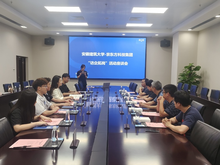座谈会上,双方就产教融合和人才培养等方面进行了深入交流。京东方HRSSC中心全球校园招聘部部长冀玮对王玉兰一行的到来表示热烈欢迎,并详细介绍京东方公司的发展概况,京东方HRSSC中心全球校园招聘经理应晓涵介绍了京东方各事业招聘需求及安徽建筑大学招聘情况、校友分布情况。学院院长戈慈水针对所访企业的岗位需求重点介绍了学院各专业的学科建设、师资力量、专业特色及育人优势。在京东方任职的安徽建筑大学校友分享了自己的工作经验,对母校的培养表示感谢,对学校近年来的快速发展和取得的成绩感到骄傲和自豪,表示将永远传承和发扬建大精神。