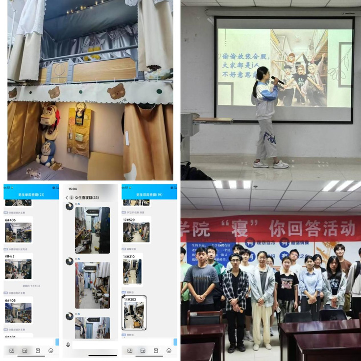 以倡导校园文明,创建和谐寝室为主线,通过开展寝室文化系列活动,如寝室装扮大赛、“厉害了,我的寝”--寝室吉尼斯活动、“‘寝’你回答”寝室安全知识竞赛等活动,促进学院温暖、和谐寝室文化氛围的形成,增强室友间的共同合作能力,让同学们用心感受生活,用爱传递温暖。