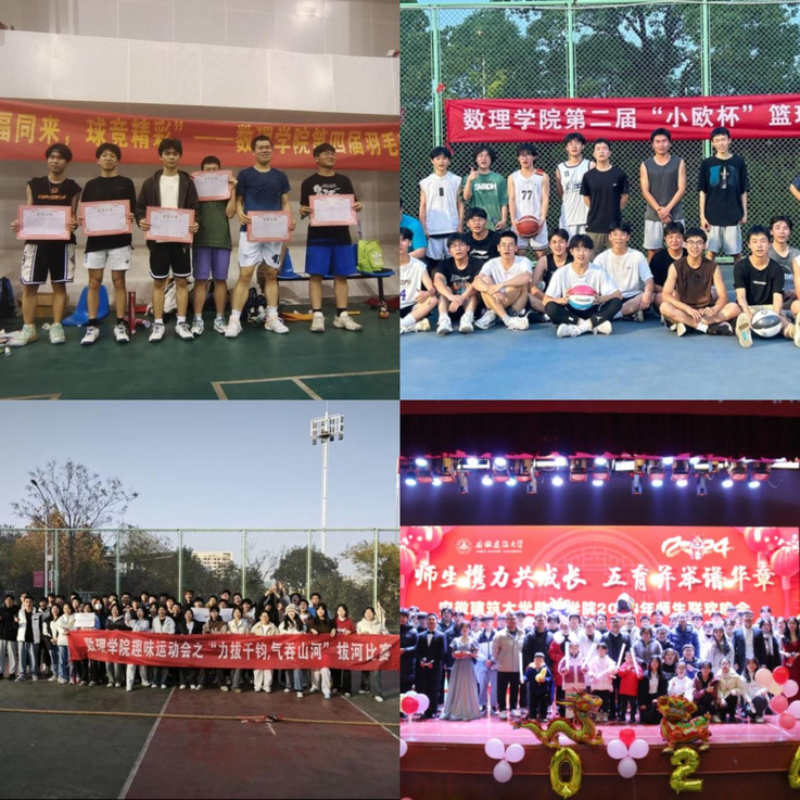 以竞技实践为主线,通过开展各类校园文体活动,引领校园文化新风尚,如彩虹跑、“羽福同来,球竞精彩”第四届羽毛球比赛、“小欧杯”篮球赛、“数理舞台,青春有你”十佳歌手大赛、“新生杯”拔河比赛、“师生协力共成长,五育并举谱华章”2024年师生联欢晚会等活动,致力于培养学生的团队精神、竞争意识、意志品质和自我认知,为广大学子实现德智体美劳全面发展搭建广阔舞台。