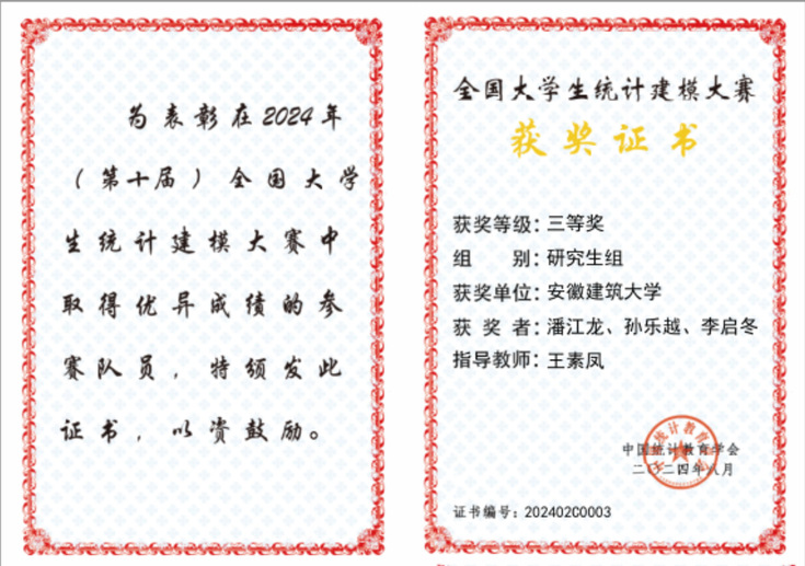 从开赛以来,教务处创新创业学院和数理学院的领导们对此高度重视,在学校各部门和其他学院的大力支持下积极组织有关工作,成立统计建模大赛指导团队,选拔、培训学生参加建模大赛。通过参与此次竞赛,我校学子不仅展示了出色的统计建模能力,还充分彰显了学生的风采,为学校争得了荣誉。数理学院将继续发挥学科专业优势、拓宽专业视野,积极探索人才培养、科学研究新机制,为培养更多复合型统计人才提供支持。(文、图:周子皓、刘彪、谢新平;一审:水天柱;二审:余江应;三审:戈慈水)