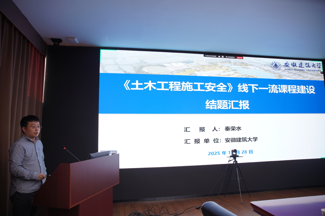 在“开放课题结题汇报”环节,会议重点交流了开放课题建设成果。秦荣水以《土木工程施工安全》线下一流课程建设的报告,围绕课程目标与体系构建、教学内容与案例资源建设、课堂组织与实践教学安排、过程性评价与质量保障等方面,系统介绍了课程建设思路与实践成效,并就如何提升线下课堂教学实效、强化工程场景融入与实践能力培养等关键问题与参会专家开展深入研讨,获得广泛关注与积极反馈。