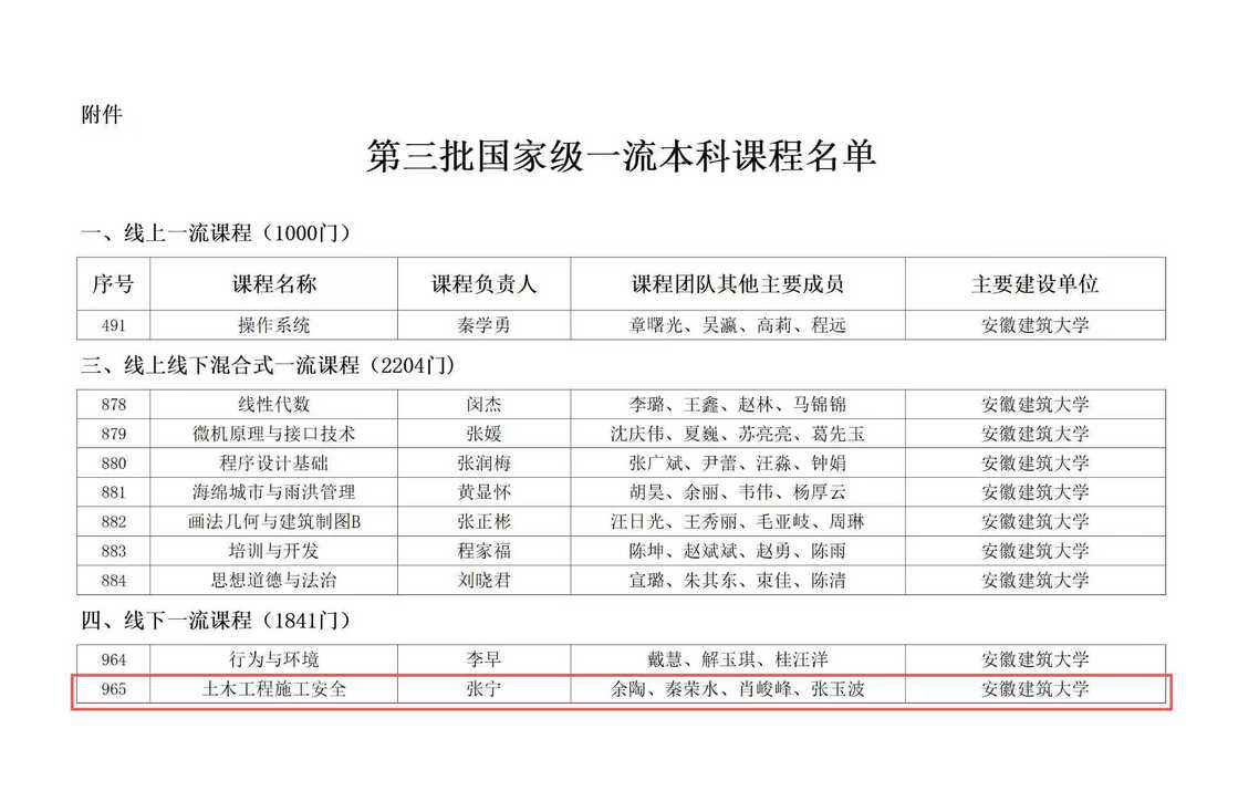 本网讯  近日,教育部正式发布《教育部关于公布第三批国家级一流本科课程认定结果的通知》(教高函〔2025〕9号),安徽建筑大学10门课程获批第三批国家级一流本科课程,其中安全科学与工程学院申报的《土木工程施工安全》课程成功入选,这不仅充分彰显了学校在教育教学改革方面的丰硕成果,也标志着我院在课程建设工作和人才培养质量上又迈上了全新台阶。