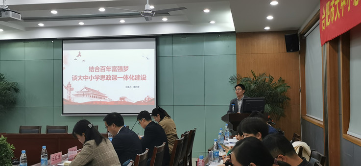备课会以“建党百年之‘富强’之旅”为主题,14名高校及中小学思政课教师结合自身教学实际,汇报了如何在大中小学等不同学段围绕“百年富强梦”开展思政课教学,并就大中小学思政课如何一体化进行了探讨。我校周叶君老师以《结合百年富强梦,谈大中小学思政课一体化的几点思考》为题发言,分析了大中小学思政课一体化的内涵、存在的问题,并结合高校思政课教学提出了发挥高校主体作用推进大中小学思政课一体化的对策与建议。