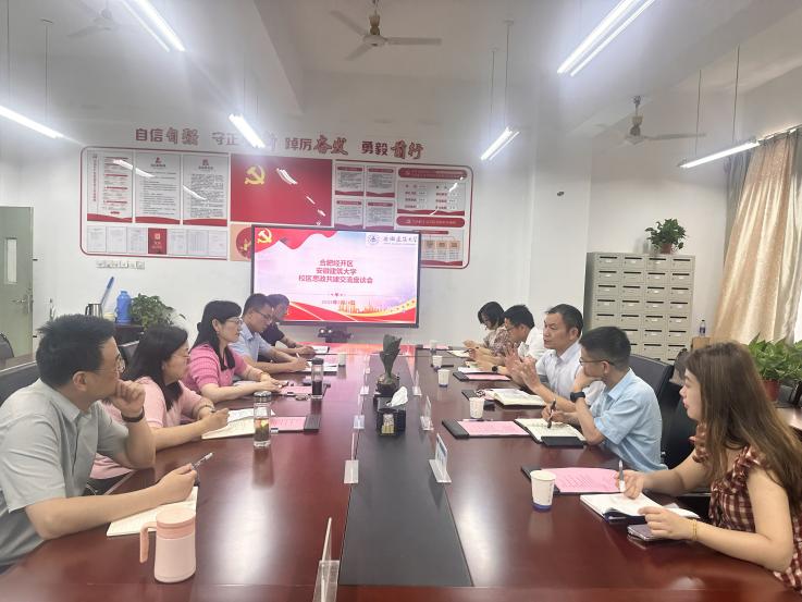 本网讯 为进一步推动校地思政合作,提升思政工作的实效性与创新性。近日,合肥市经济开发区党政办公室副主任张和允一行来我校开展思政共建交流座谈会。安徽建筑大学校办公室领导、马克思主义学院领导班子、教研室主任代表参会。