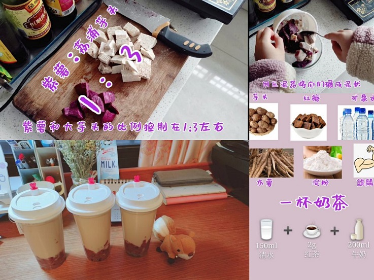 在外求学的学子常常想念“妈妈的味道”,居家学习期间的同学们有了更多的时间陪伴父母,也有了更多时间分担家务。本次活动深受同学们的欢迎,参赛者提交的菜品各式各样,黄焖鸡、臭鳜鱼、家常豆腐、红烧肉、奶茶甜品等应有尽有,每一个作品都以PPT或者Vlog等形式详细介绍了所用食材、制作工序及其营养价值,准备的认真又有趣。最终,19地质的陈婷玉同学制作的“芋泥波波茶”Vlog通过活泼生动的拍摄手法以及细心全面的介绍获得本次活动的一等奖,她表示,希望一杯暖暖甜甜的茶能让辛苦工作的妈妈放松下来,感受生活的美好。