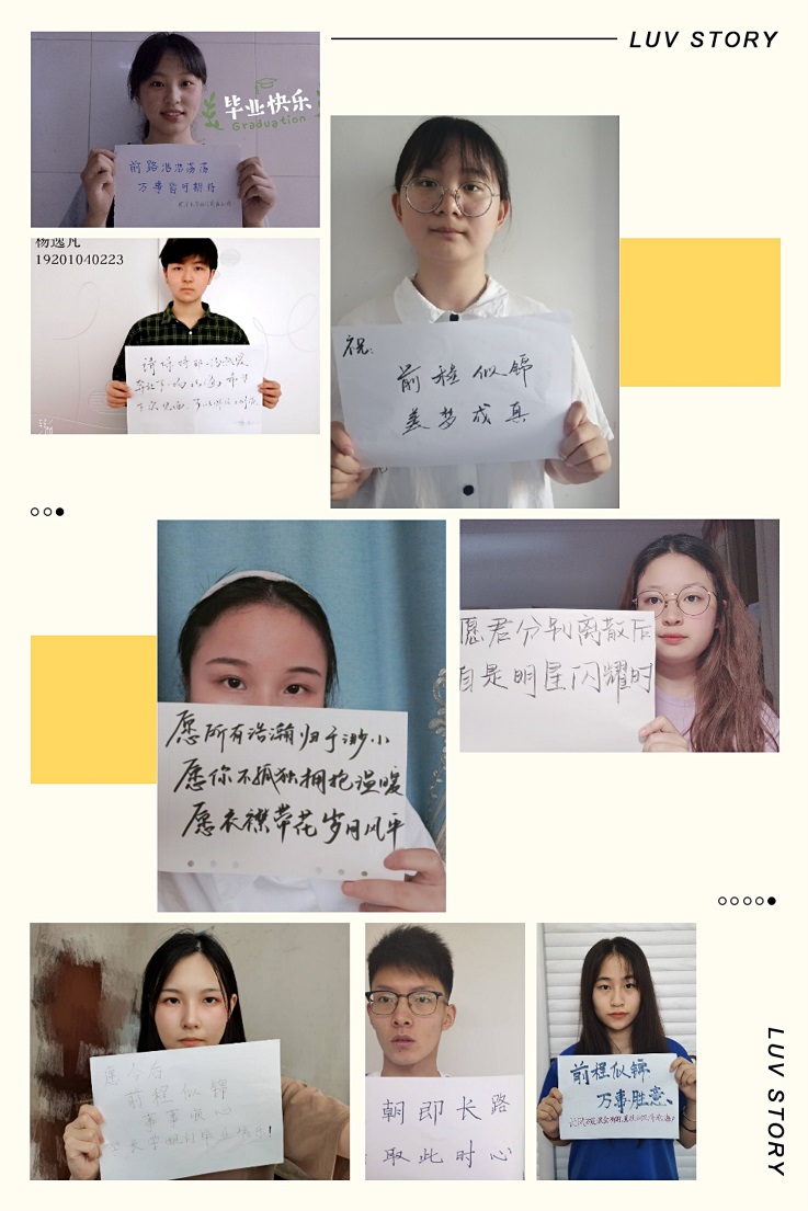 “回首,是一段青春无悔的岁月;前往,有一个繁花似锦的前程” “希望学长学姐,毕业找到好工作,天天开心,前程似锦” “祝学长学姐,乘风破浪,万事胜意” ...... 厚土承德,菁木兴华,土木学子,善建不拔。四年来,土木学院一直以爱筑造,用希望浇灌着这个温暖的大家庭。学弟学们们的真诚祝福、学院学校的淳淳教诲,将成为毕业学子人生路上的最好陪伴和力量源泉。希望2020届毕业生在下一个人生阶段可以用青春的画笔,渲染更美好的明天。伴着欢笑与泪水、温情与澎湃,深情送别2020届毕业生。愿你们带着母校的牵挂与祝福,乘风破浪,不负锦绣年华。(作者:王月竹 许峻琪 郑方醒;审稿:胡燕青) |