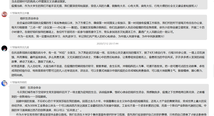 汪步鑫同志说道:自全省启动新冠肺炎疫情防控Ⅰ级应急响应以来,为了方便工作,确保第一时间落实上级指示、第一时间接收疫情工作报告,我们村的村干部每天吃住在办公室,每天行程都是“三点一线”(会议室——办公室——基层)。在辖区发现确诊病例后,他们迅速组织人员启动疫情防控应急预案,依托小区物业建立值班室,开展二十四小时值守。在做好组织指导的基础上,各位村干部同志一起参与值班值守工作,带头参加消杀灭和清洁工作,赢得广大人民群众的一致认可。作为一名党员,我一定要向优秀学习,向先进学习,牢记我们共产党人的初心和使命,为中国人民谋辛福,为中华民族谋复兴! 本次活动结束后,党支部全体党员一致认为,通过观看微党课,受到了一次深刻的党性锻炼和难忘的精神洗礼,深切体会到总书记对青年一代坚定理想信念、校准人生航向的谆谆教导,更加了解我们党的光辉历史、伟大成就和优良作风;同时组织生活会活动也让大家坚定信仰,牢记宗旨,激励每一位支部党员为实现“两个一百年”奋斗目标和中华民族伟大复兴的中国梦作出更大贡献。 作者:胡正涛,程俊俊;审稿:胡燕青 |