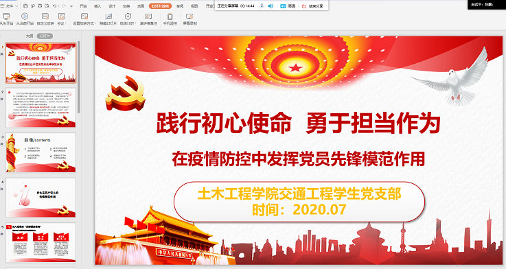 本网讯 为深入学习贯彻习近平总书记对于新型冠状病毒感染的疫情的重要指示精神,进一步推动我院基层支部建设,提升学生党员政治素质和党性修养,土木工程学院交通工程学生党支部于2020年7月12日下午召开以“践行初心使命,勇于担当作为—在疫情防控中发挥党员先锋模范作用”为主题的线上微党课暨组织生活会。会议由党支部书记周其明同志主持,全体学生党员出席本次会议。