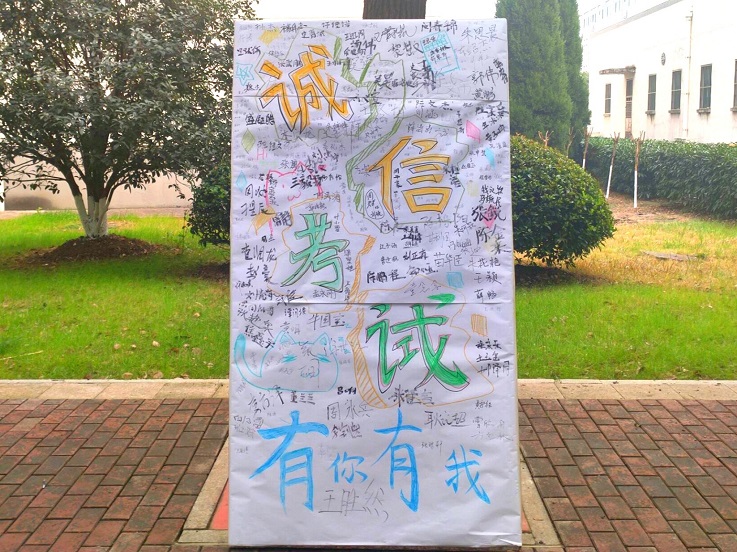 本网讯 随着期末考试的临近,为了加强大学生的诚信教育,提高同学们诚信应考的意识,营造良好的考试氛围、净化考场环境。近日,土木学院举办了“诚信考试,杜绝作弊”诚信考试签名活动,各年级学生积极参与此次活动。