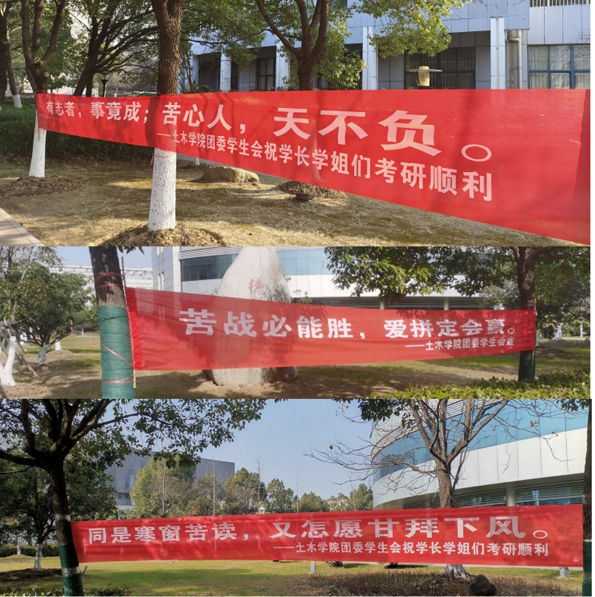 希望这些真挚的祝福能让考研的同学们在接下来几天的考试中稳定发挥、旗开得胜,取得理想的成绩。土木考研人,为梦想而战吧,愿你们一“战”成硕、金榜题名!(文/图:王月竹 赵培芸;审核:王媛) |