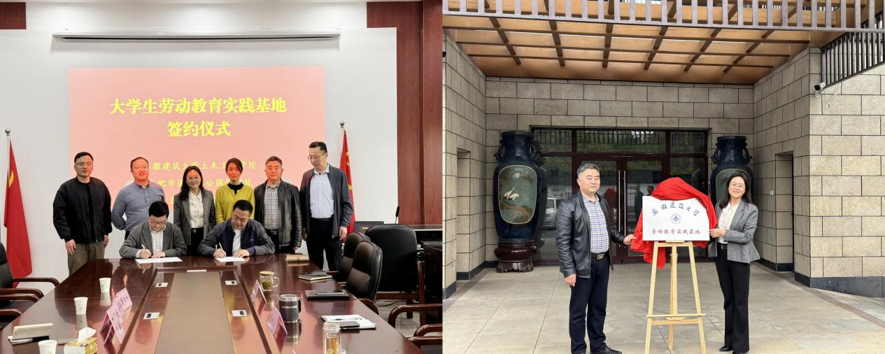 启动会上,胡从容对安徽建筑大学土木工程学院一行的到来表示热烈欢迎,对共建大学生劳动教育实践基地充满期待,希望通过共建优势互补、合作共赢,推动管理处工作高质量发展。朱金亮介绍了管理处的基本情况和历史发展,逍遥津公园作为合肥环城公园“翡翠项链”上的璀璨明珠,是合肥城市文化的重要名片之一。王媛对管理处提供优质的劳动教育实践平台表示感谢,学生能够在具有丰富历史文化底蕴和优美的自然景观中开展劳动实践,是劳动教育、美育教育、文化修养等多方面的提升发展。施国栋介绍了学校关于劳动教育的的实施方案,理论与实践相结合,主要培养大学生劳动意识,树立劳动观念,强化劳动自觉与责任感,逍遥津公园作为开放共享式的城市公园是开展劳动教育实践的理想平台。会上双方进行了签约和揭牌仪式。