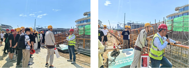 在第一个建筑工地,同学们观察了交通工程建设和隧道施工的项目内容。现场工程师为学生讲解了施工管理、质量保障、进度控制、安全防护等相关知识。参观过程中,学生积极了解和学习施工现场情况,并就参观过程中遇到的具体问题,主动向随行的老师和工程师请教,加深了对课堂学习知识的理解。