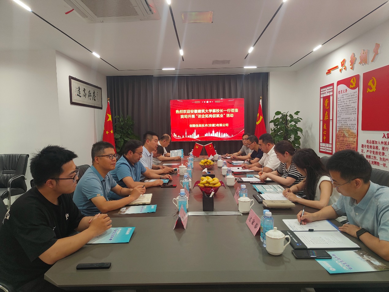 “就业是最大的民生”。蔡国军表示,学校认真学习贯彻习近平总书记关于做好高校毕业生就业工作的重要指示批示精神,把毕业生就业工作摆在突出位置,多措并举、精准施策,不断提高就业工作质量和效率,努力促进毕业生更加充分、更高质量就业。创图信息技术(安徽)有限公司作为一家年轻的高新技术企业,有近二十位员工是我校校友,体现了校友“心系母校、回馈母校”的校友情怀,是我校校友企业的杰出代表。蔡国军希望通过此次校企合作交流暨“访企拓岗促就业”专项行动,双方能够在产教融合、科技创新联合公关、科技成果转化等方面进一步深化交流合作。