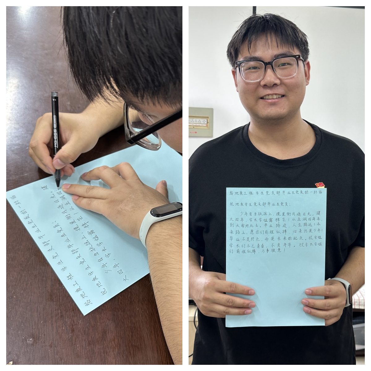 道一声祝福 支部低年级党员江旭撰写《给地质工程学生党支部毕业生党员的一封信》,将美好的祝福带给毕业生党员。“少年自当扶摇上,揽星衔月逐日光。建大四年,学长学姐露锋芒!从五湖四海来,到天南地北去。毕业路近,人生路远!未来路上,愿你们前程似锦,归来仍是少年!毕业不是终点,而是未来的起点。祝学姐学长们不忘青春,不负年华。祝学长学姐们前程似锦,万事顺意!”地质工程学生党支部2021、2022级全体党员为地质工程学生党支部毕业生党员送去这样一份真挚的祝福。