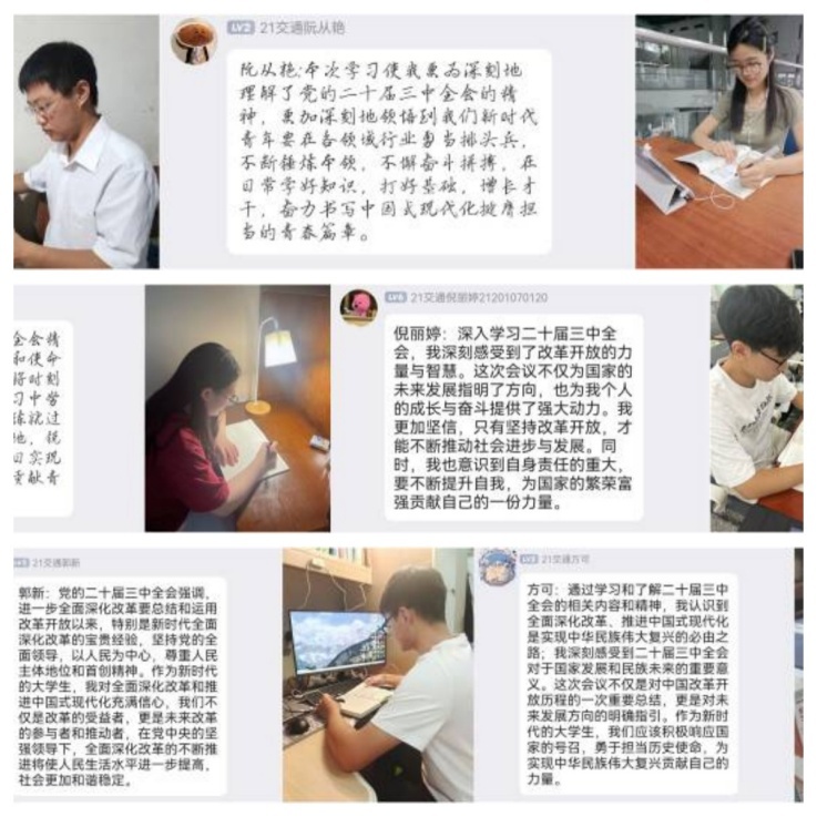 在学习过程中,支部同志们认真总结学习内容,踊跃分享学习成果,交流对会议精神的多维度多角度认识,相互促进,相互提高,对会议精神的理解更加全面深刻,有利于转化为实际的贯彻行动。 荣光祖同志认为,党的二十届三中全会精神是新时代中国发展的重要指南。通过深入学习,我不仅对全会提出的各项改革举措和政策导向有了更全面的理解,更对党的坚强领导和中国特色社会主义制度的优越性有了更深刻的认识。 郭新同志说,党的二十届三中全会强调,进一步全面深化改革要总结和运用改革开放以来,特别是新时代全面深化改革的宝贵经验,坚持党的全面领导,以人民为中心,尊重人民主体地位和首创精神。 阮从艳同志表示,深刻地领悟到我们新时代青年要在各领域行业勇当排头兵,不断锤炼本领,不懈奋斗拼搏,在日常学好知识,打好基础,增长才干,奋力书写中国式现代化挺膺担当的青春篇章。 通过此次主题党日活动,进一步激发了党员的奋斗精神和创新活力,同学们将以更加饱满的热情和更加昂扬的斗志,投身到新时代的交通事业中,为构建现代化高质量综合立体交通网、推动交通运输高质量发展贡献交通工程领域的智慧和力量,为实现中华民族伟大复兴的中国梦贡献青春力量。(文/图:周其明、荣光祖;一审:叶训;二审:陈东;三审:王媛) |