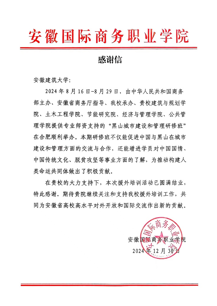 本网讯 近日,学校收到了一封来自安徽国际商务职业学院的来信,对土木学院在“黑山城市建设和管理研修班”中提供专业支持和无私帮助的表达了诚挚谢意。