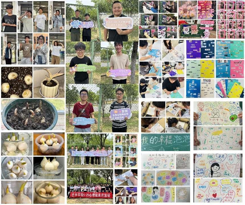 点亮 “心灯塔” 打造多元主题活动 学院以丰富的活动为载体,营造关注心理健康的良好氛围。开展“5・25 心理健康月”系列活动,举办心理情景剧大赛、心理健康知识竞赛、户外素质拓展等特色活动 12 项,参与学生超1500人次。 其中,通过“郁”见美好,播种希望——郁金香种球领养活动,以亲近自然的方式,关注大学生心理健康,帮助同学们释放压力,提升心理健康水平,共同播种希望,“郁” 见美好。三行情书创作、涂鸦横幅互动、趣味Kt板合影打卡等新颖有趣的形式,将心理健康教育与土木学院专业特色融合,不仅为同学们提供了表达情感、释放压力的平台,更增进了同学之间的交流与互动。有效引导同学们树立积极向上的生活态度,增强了心理健康意识,让“5・25——我爱我”的理念深入人心。同时,推出 “心灵树洞” 线上平台,为学生提供便捷、私密的倾诉渠道,切实为学生点亮心灵灯塔。这些活动让大家意识到,心理健康不是“有问题才需要关注”,而是像锻炼身体一样需要日常维护。